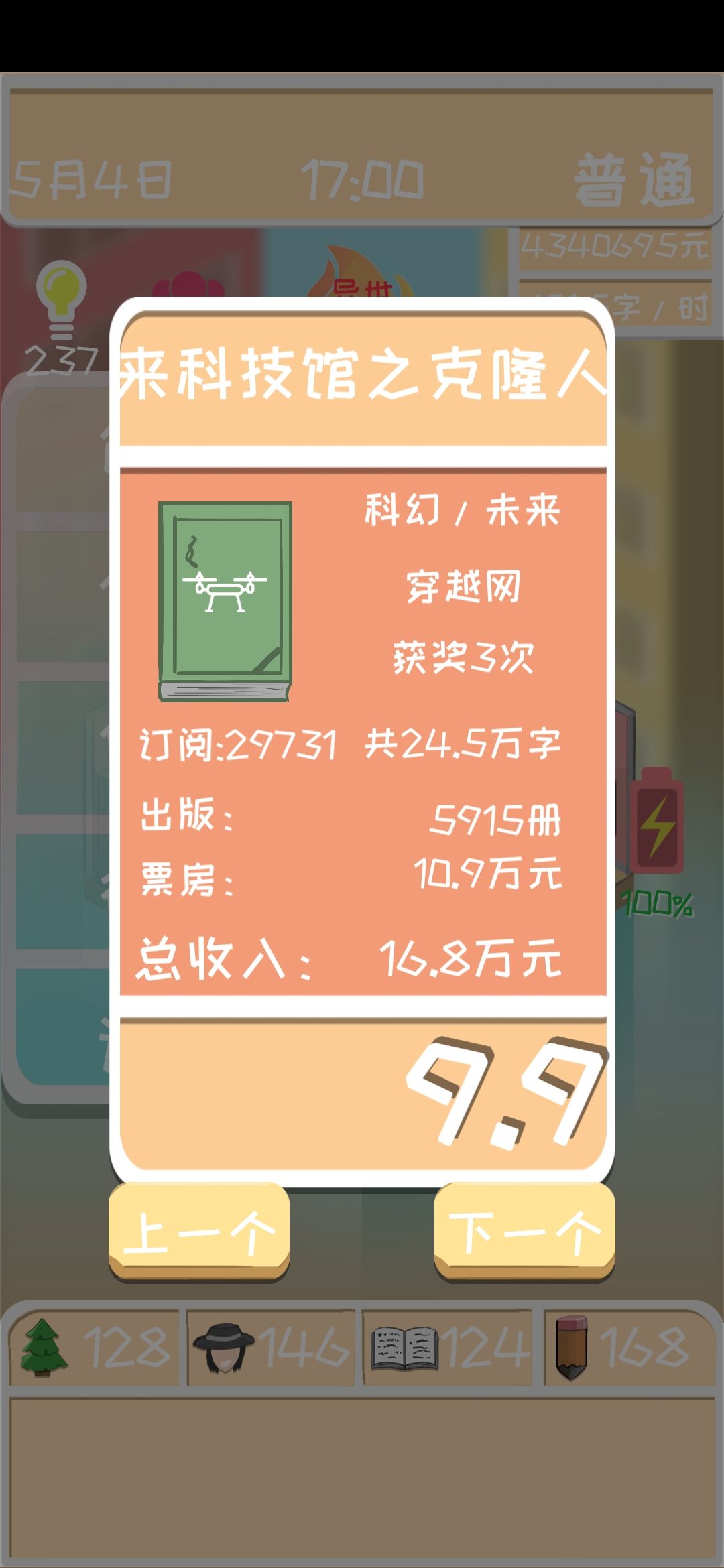 灵感够了就可以开书了,开始选的题材不是很火就放弃,重新选火的题材,写第一本书把题材选好后就可以开始了(一定要选火的题材),灵感投入不要乱投根据你的文爱来投,你开局文笔11-19左右就投20-30的灵感,不要管有没有坑,坑不重要,也不要去填坑。灵感投入只能涨不能减。就这样就可以获得奖。第一本书差不多能给你带来15-30万的收益。(不要一直写,电影放一个月完就完结,坑不用填。填坑掉评分)中途记得学习,升级房子电脑和床,最好是能在写第2本书时4围在30以上。