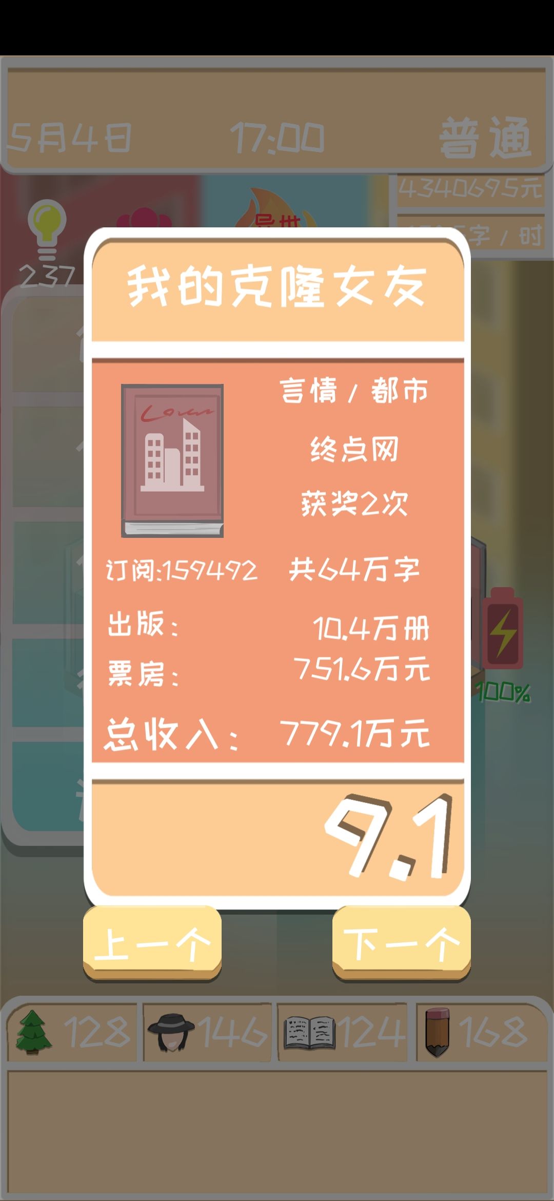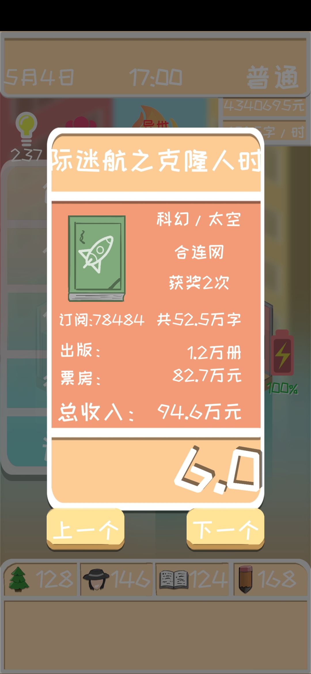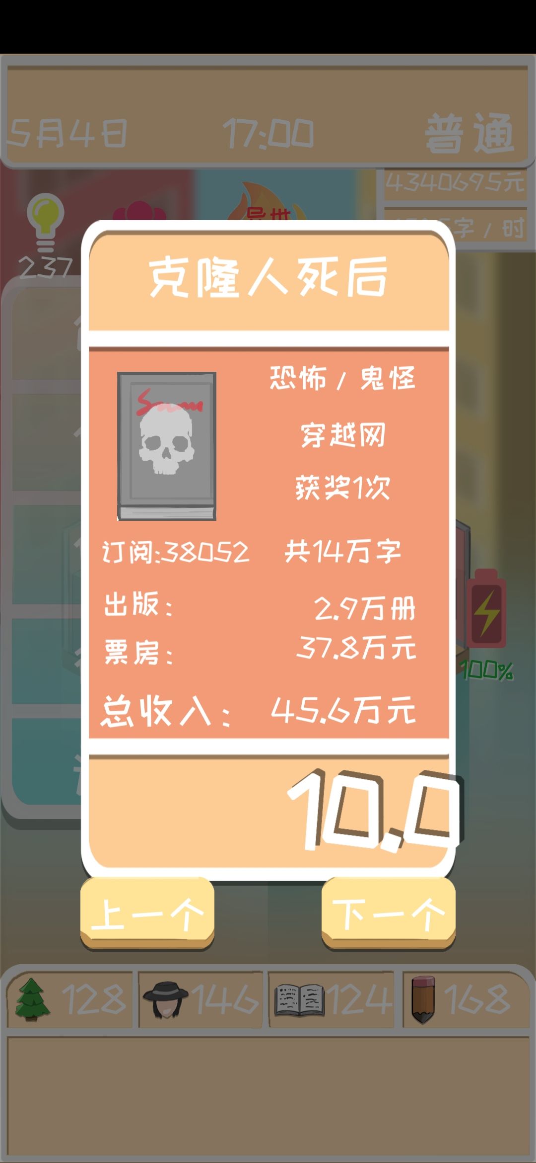 关门作品来了。现在就是钱已经花不完了。就把4围提高到120在写。灵感投入130-200。疯了去刷灵感。最好能有2000-2500灵感再开稿(要在终点网每日一更就得1500/时的速度)开始1.5天一更就好了。只要电影一上映你就有700万+的收入了。