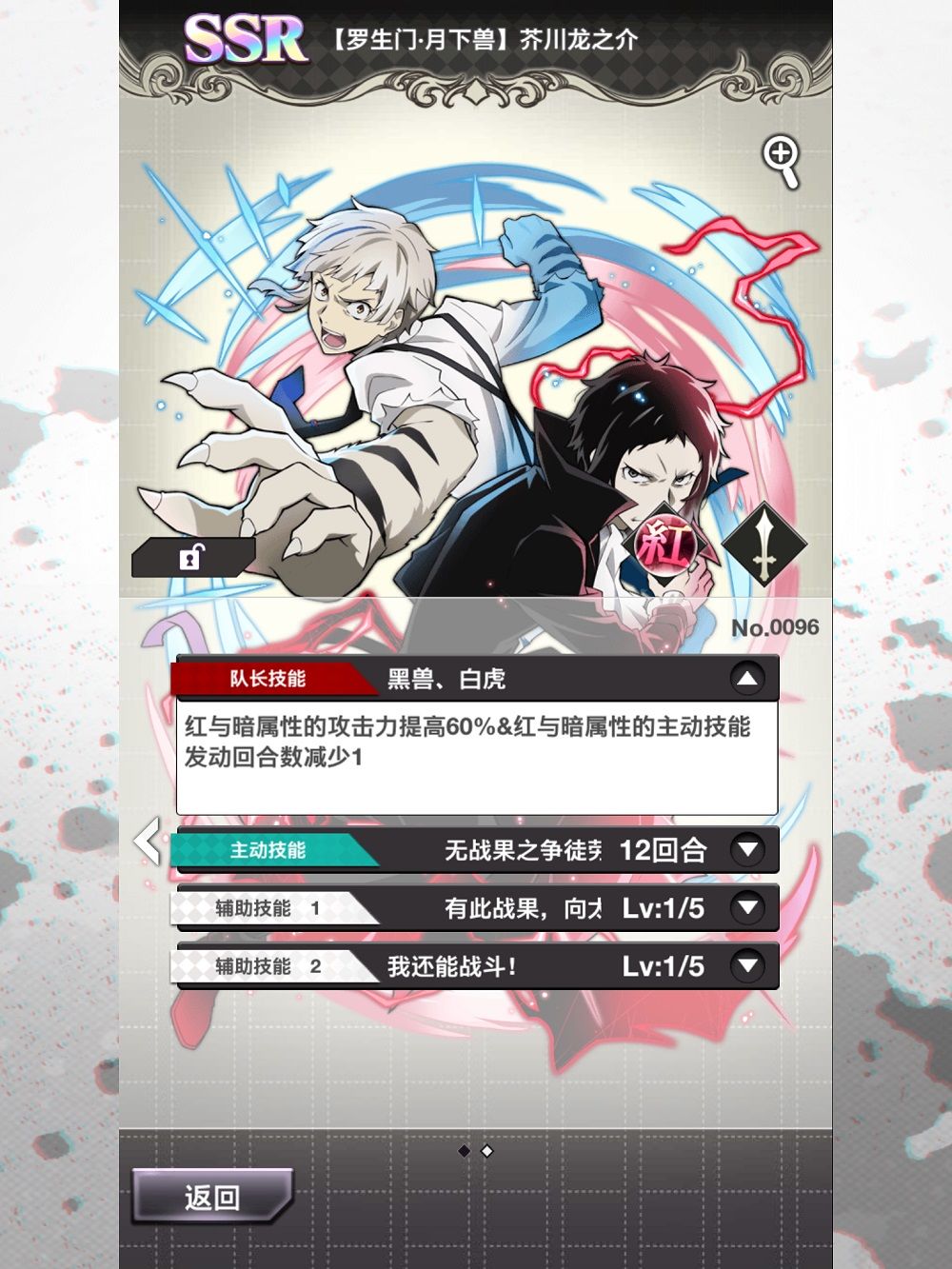 所以说前期在选择属性时,如果你能有一张冲击宰这样的泛用队长卡,就完全可以任意组合你的阵容,但是如果你前期抽到的SSR泛用性不高,比如【罗生门·月下兽】芥川龙之介的队长技能就是提升60%的红属性和暗属性攻击力。那这个时候如果你随意组合阵容,效果自然会大打折扣。