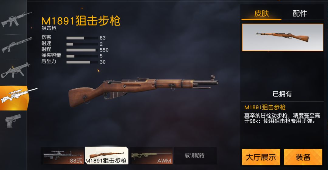 M1891狙击步枪是游戏中比较容易获取的狙击枪,具有83的高伤害值,是所有狙击枪中伤害排名第三位的狙击枪。相对于同样较易获取的毛瑟狙击枪来说,M1891狙击枪更胜一筹。在刚落地时,可作为我们的首选狙击枪。