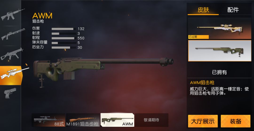 AWM狙击枪是游戏中最难获得的狙击枪,只在空投中刷新。具有132的高伤害值,是所有狙击枪中伤害值最高的,任何头盔和护甲都抵挡不住AWM两枪的攻击。荒友们有梦想的话,可以试着追一追空投,说不定就可以捡到它。追逐梦想也是有风险的,时不时地就会来场遭遇战,可能一不小心就在追梦的道路上一去不复还了。追梦道路千万条,安全第一条,拾取空投不规范,队友两行泪