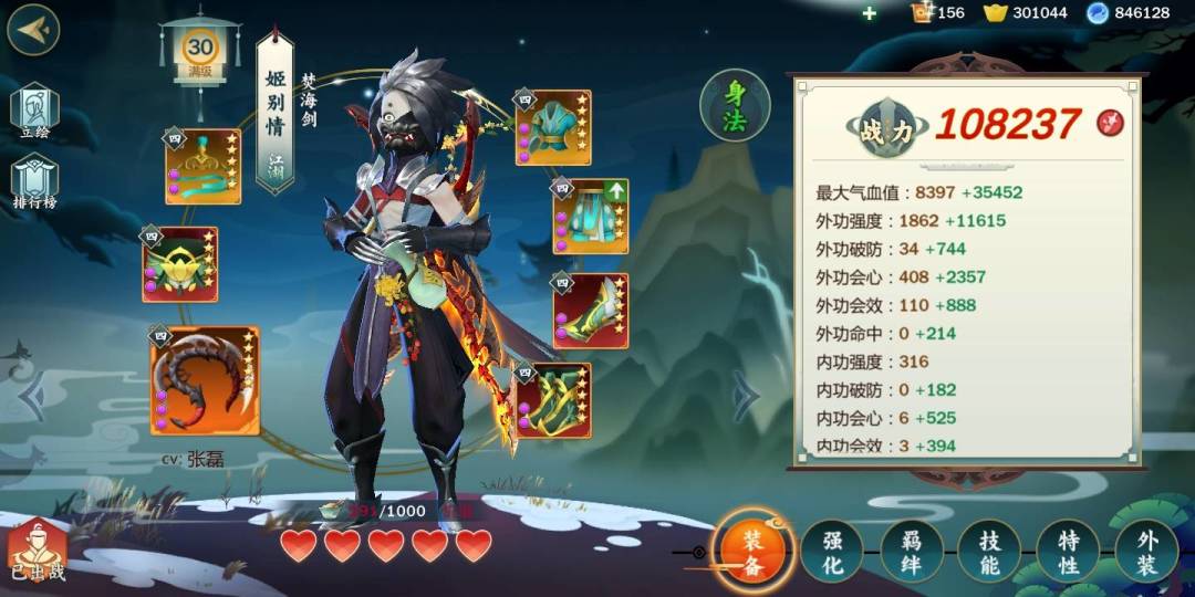 特性:一代宗师,侠肝义胆,心狠手辣,兵机,洞察人心、骨骼惊奇。特性方面不需要多说,主堆面板,只靠平a的话不吃任何状态加成。