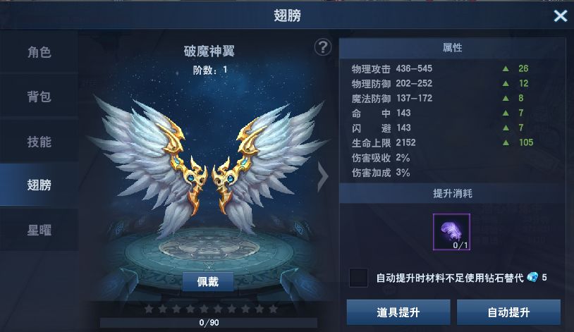 翅膀的阶级是玩家最应该考虑的事情,积攒提升道具才是首要任务,玩家可以通过商城、锁魔塔、斗气商人等方式获得不同阶级所用的道具,强大的属性必然会成为玩家最大的动力,但高阶的“翅膀”外观也会有所变化,更为炫酷!
