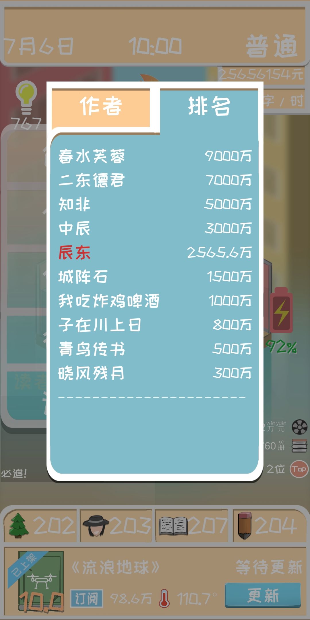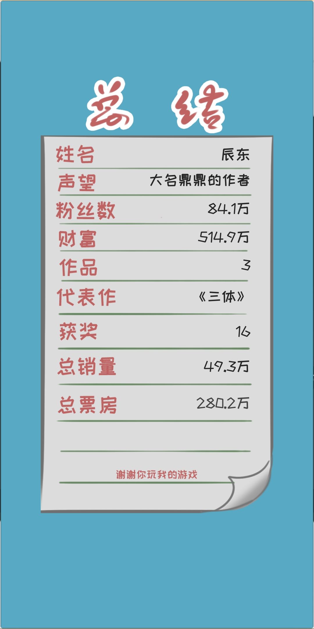 然后继续撰稿到6.1日再出书,6月左右把2000钱加到属性里去,前期不要加写书速度,其余的平衡着加就行了。(亲测,后期1小时2500字封顶,一天不要求质量的话出个五章很轻松。)书名可以不和那个月热门的一样,只要搭配好就行,5.1出书的话,你那个月没有办法写书,因为你钱不够你活到6月,如果你5月出书的话,要不就是赚400钱以后再出书。所以楼主还是希望大家到6月再开始出书。提前攒一个月的房租,前期一定要控制好自己的金钱数,房租一定要留着。不然重新来过,存档的机会作者都不给你留😂😂