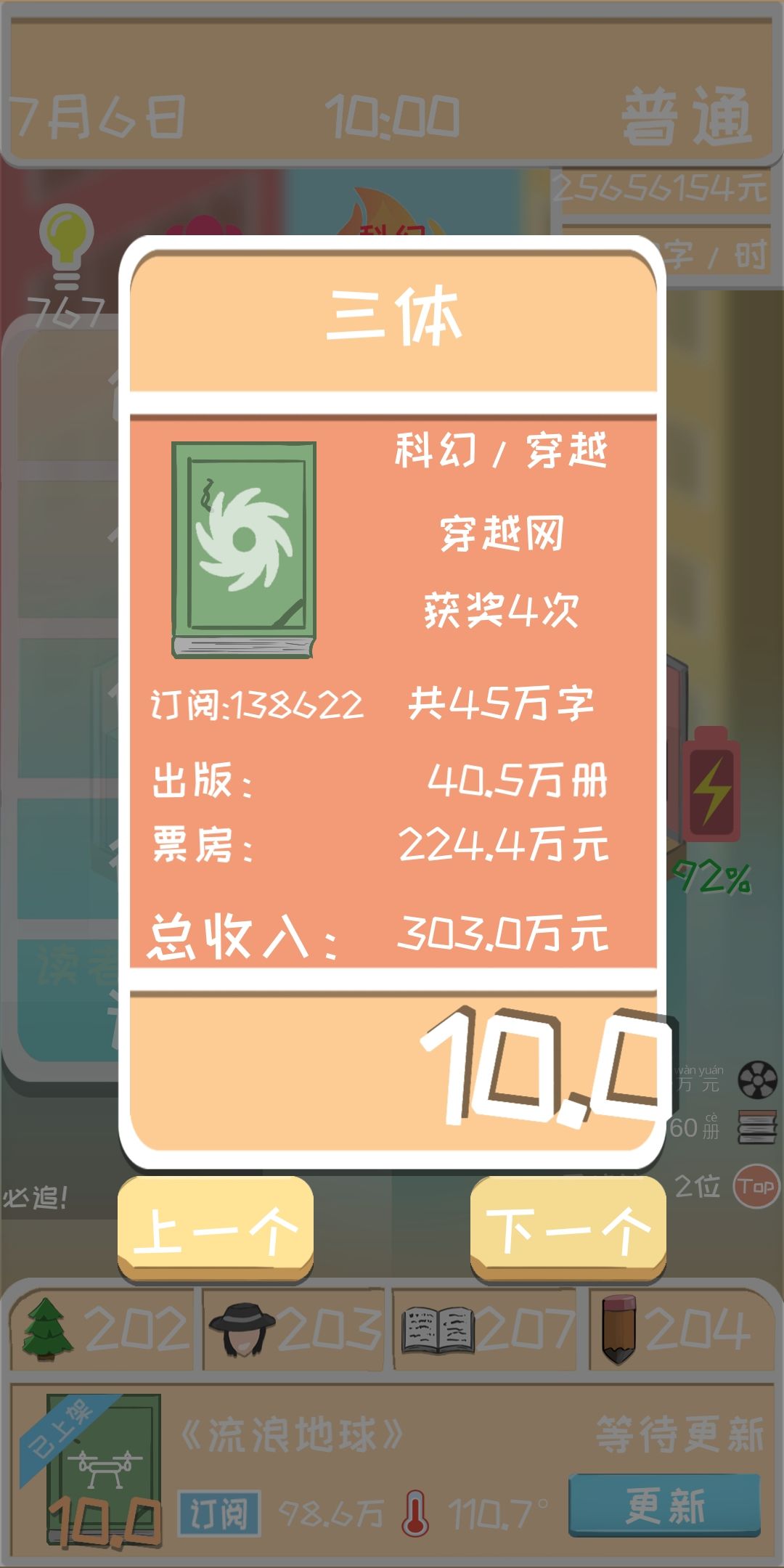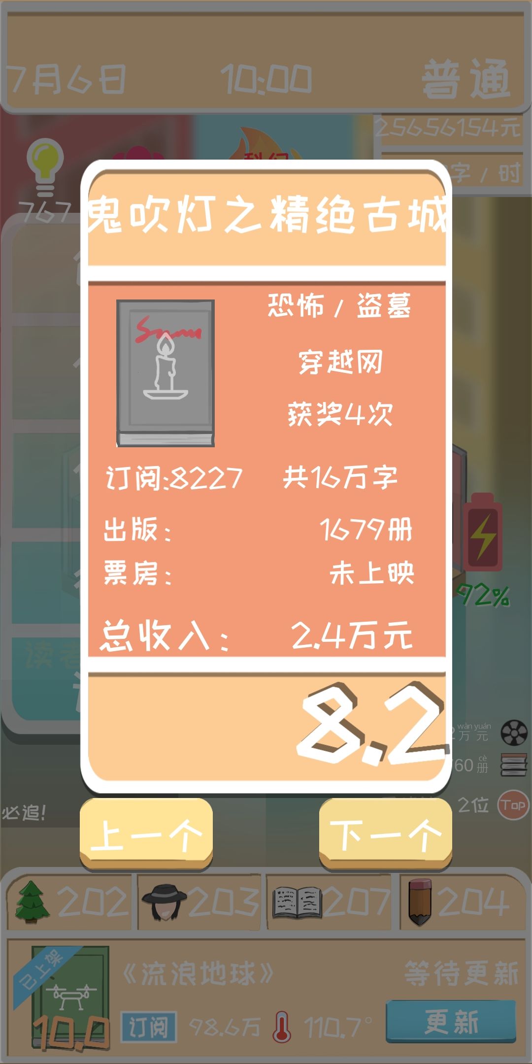 出书需要注意的是,灵感当然是越多越好,注意观察下面的小字,前期前两章建议用大量的灵感,然后选用积极的灵感,因为灵感越高,书的评分也相应提高。第一本书尽量在坑能填满的时候就完结,不然会扣除相应的费用。(第一本书不用等电影版权,太慢了,要到十万订阅好像才能收到信,第二本就等到电影上映结束以后再完结,电视版权最便宜就给一万块钱,作者不知道怎么想的,后期上千万的电影票房等你来拿。每本书电影上映完就准备完结准备出下本书。)