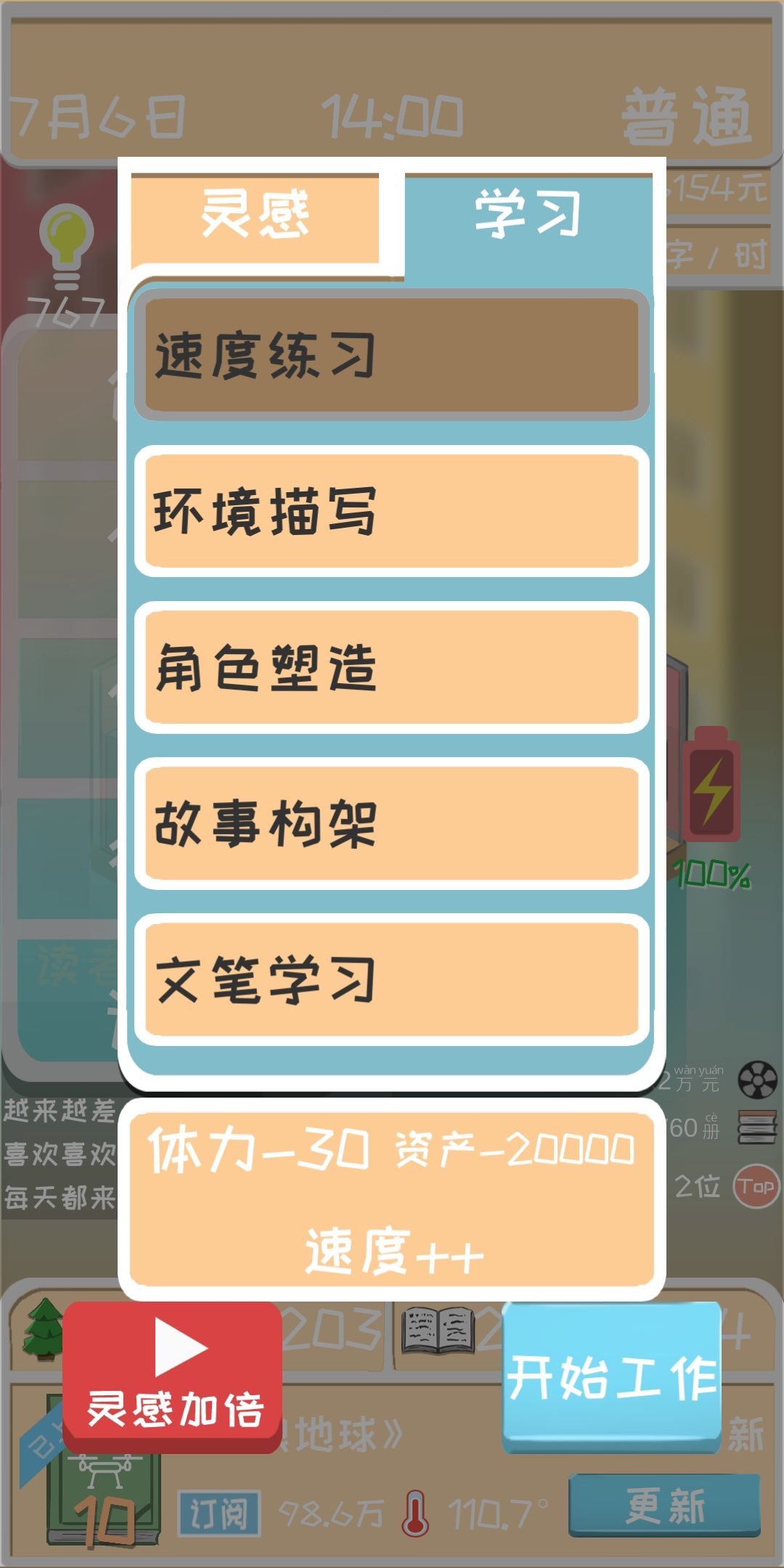 每本书出完的休息日,建议把灵感刷到999,还有属性也可以趁中间这段时间升升。后期写书就用大量的灵感,评分基本保持在10分不会变。