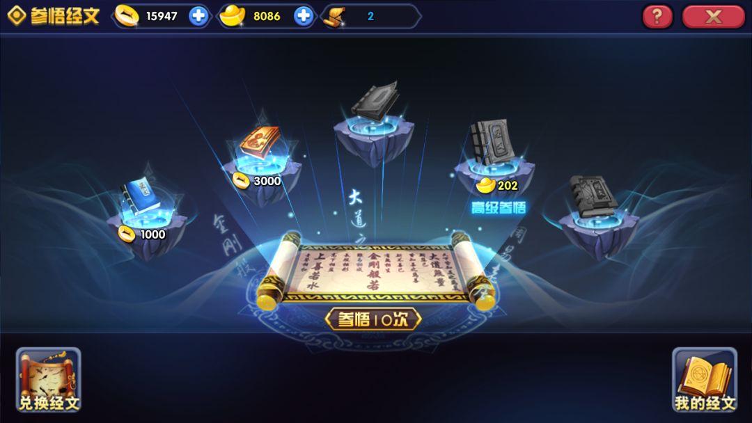 四个参悟7000铜钱(这个第四个经文有一选项)可以使用200元宝高级参与,用元宝参悟高级经文基本给的都是中级经验经文,概率性给出高级经验,极小概率出橙色经文,同时他也概率性遇到第五个参悟,