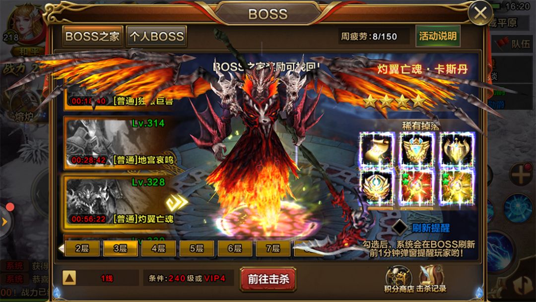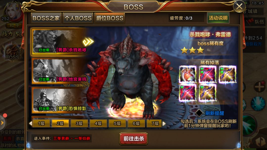 爵位BOSS共7层,每层展示4只BOSS,每层根据爵位的等级划分的,爵位越高,能挑战的层数越多,同时获得的装备也越高。