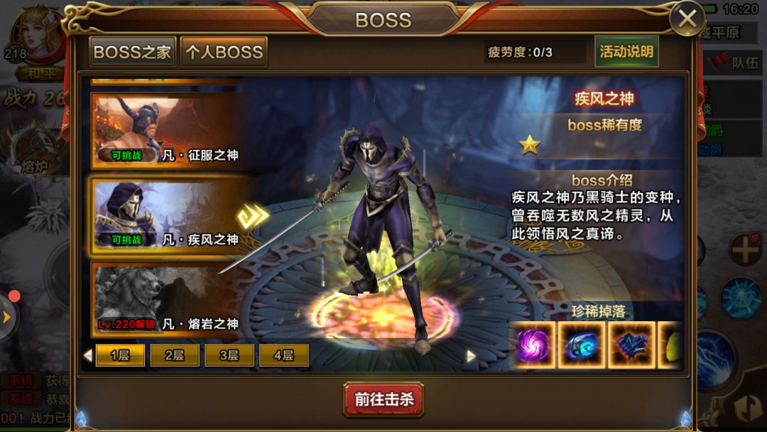 BOSS中展示着所有游戏中每一层能够挑战的BOSS类型,玩家可以一目了然选择挑战自己想要挑战的BOSS,以及挑战特有的BOSS所需要的各种条件。目前已开通了BOSS之家、个人BOSS、爵位BOSS这三种类别的BOSS挑战。
