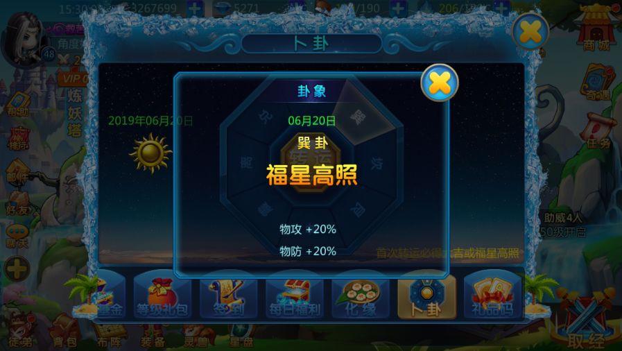 玩家每日登陆游戏都能参与一次卜卦活动,点击卜卦每天都能获得一个独特的BUFF效果