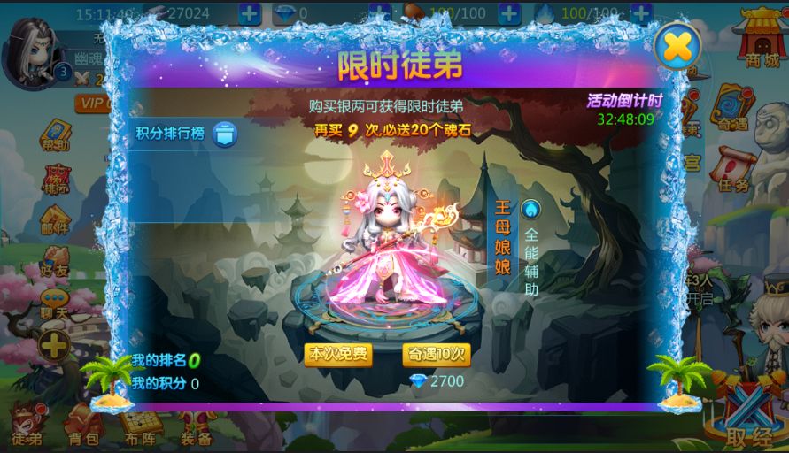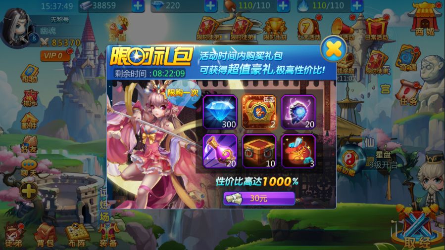 限时礼包性价比高达1000%,此活动礼包仅开放三天,并且每天礼包每个玩家限购一次,目前性价比最高活动之一,想尽快提高徒弟属性及战力的玩家可以关注一下