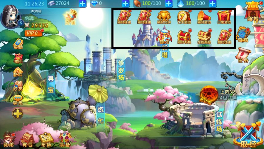 为了小伙伴儿们更好更舒适的体验游戏,我们在游戏内为大家准备了各种各样的限时、以及日常的福利和活动等待大家参与,活动位置下图已黑框标出,在这里小编为大家推荐一些几个性价比较高的活动,大家千万不要错过哦