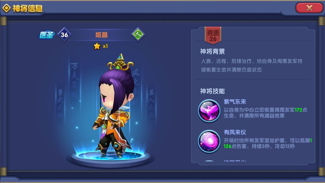 而姬昌1技能加血清除负效,2技能加全员护罩,持续3秒,CD12秒。