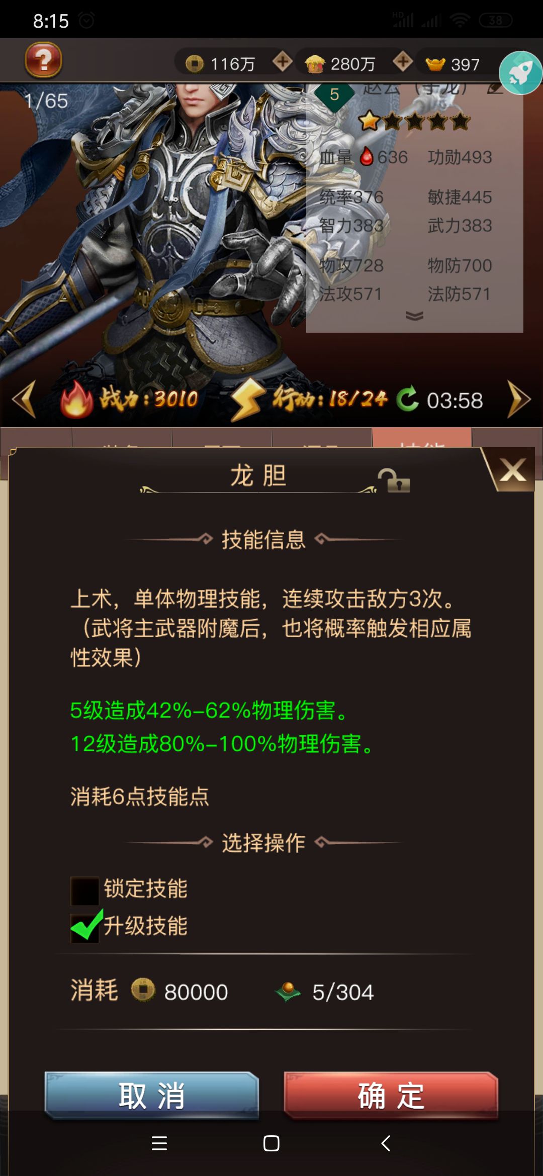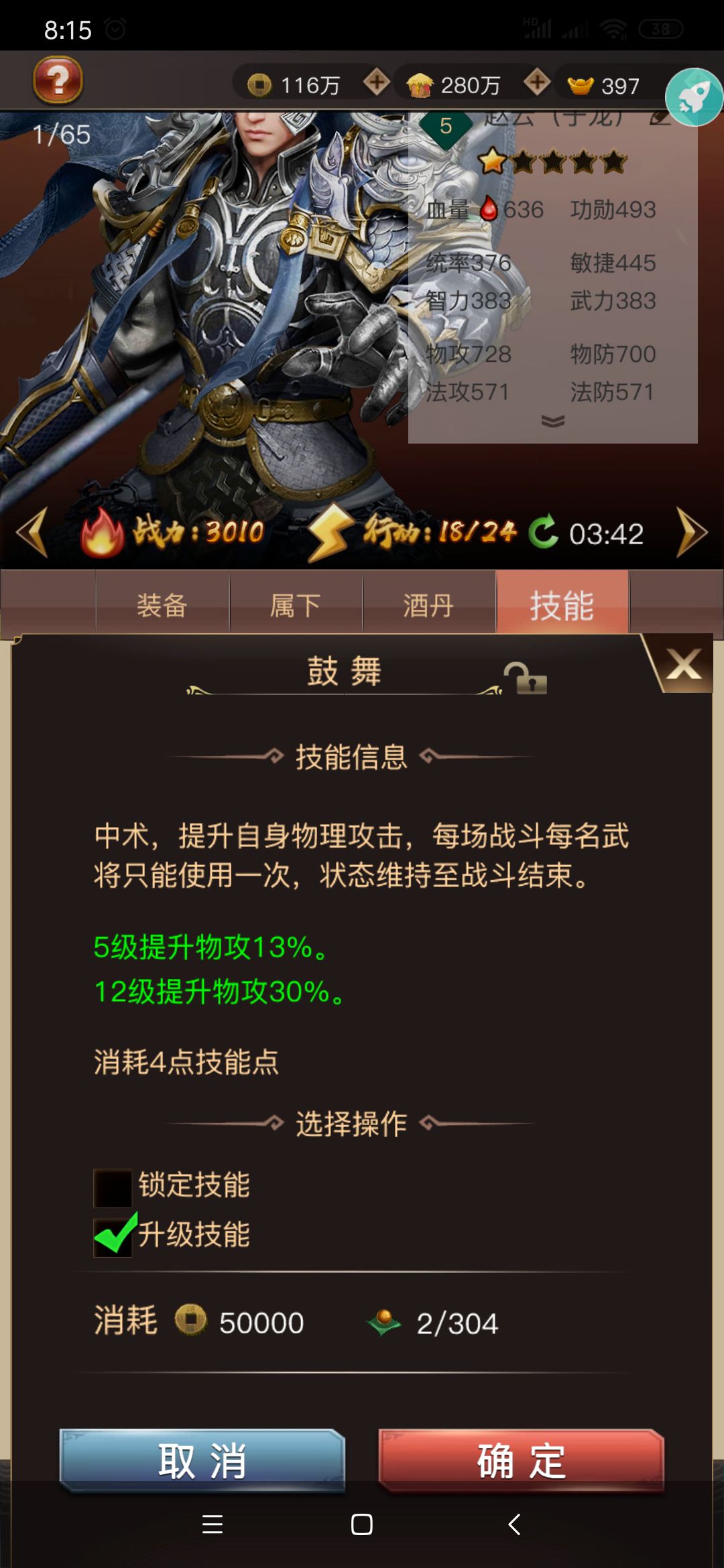 技能有三行,出战可以三行间切换,也可以打乱每个技能在每行的分布(这个不怕花钱客气游戏里刷)。技能选择建议主动技能2辅助1进攻,因为战斗模式是所以上阵4个将共用技能点(技能点初始3个,上将星4个,每回合增长1点),所以技能多了真用不上,不如辅助技能堆属性
