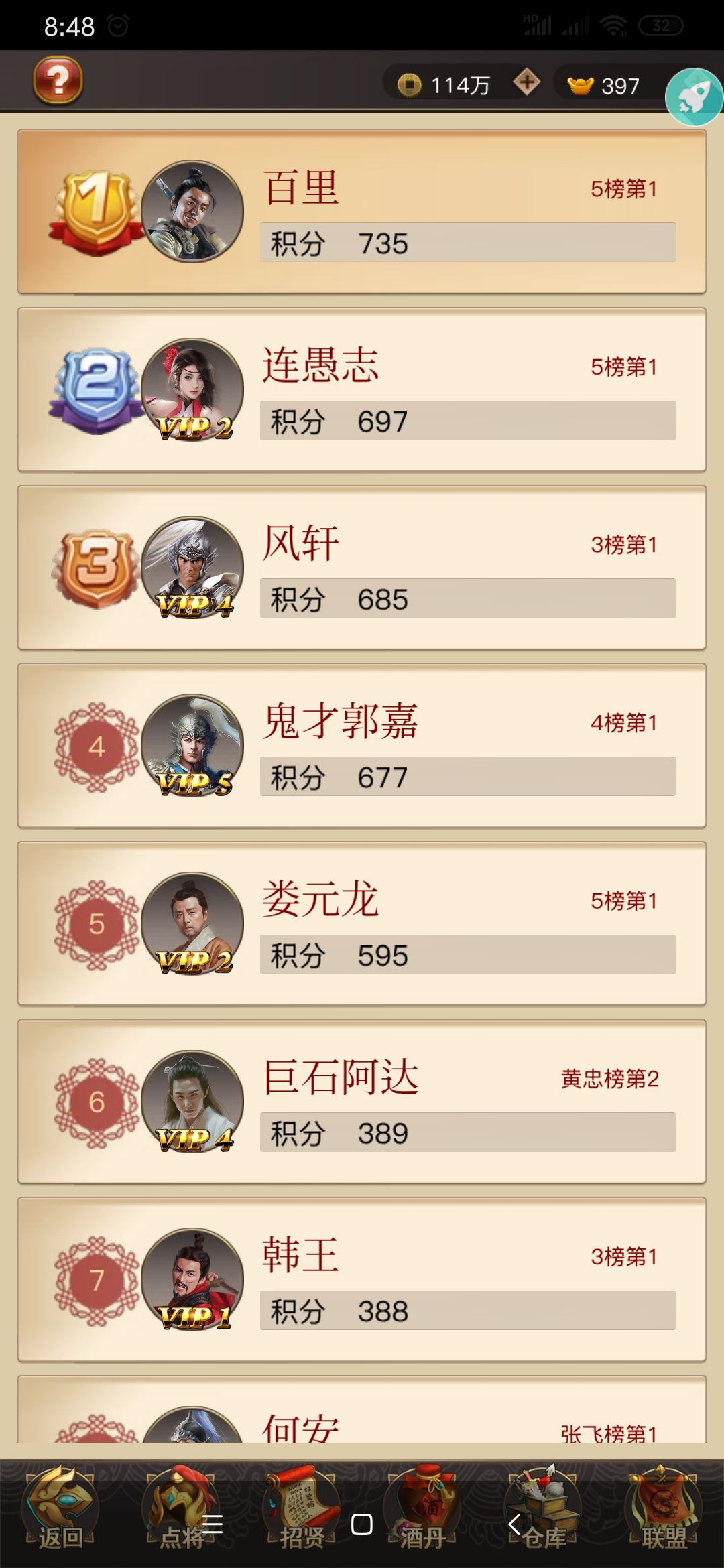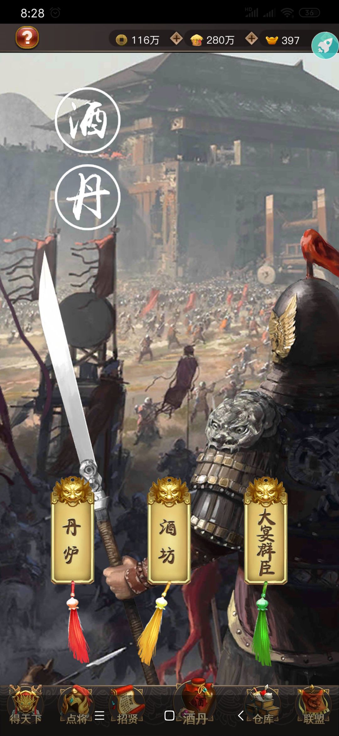 2.再讲下初期要点前期徐庶任务向你要100元宝,不要给,不给也归顺能省100元宝前期赵云任务第一阶段初遇赵云,故意输,给金将张辽(非常重要,每天中午有张辽专属任务),第二阶段任务不要接,要求1小时内战胜赵云2000战力,不急主公升级升装备和酒吃丹+徐庶很快就双1800-2000,保险点加上送的将辛宪英和严良,很容易3.关于日常资源获取屏幕上面有活动按钮,右面有个任务按钮进去看看,基本就掌握了。重点是酿酒和炼丹