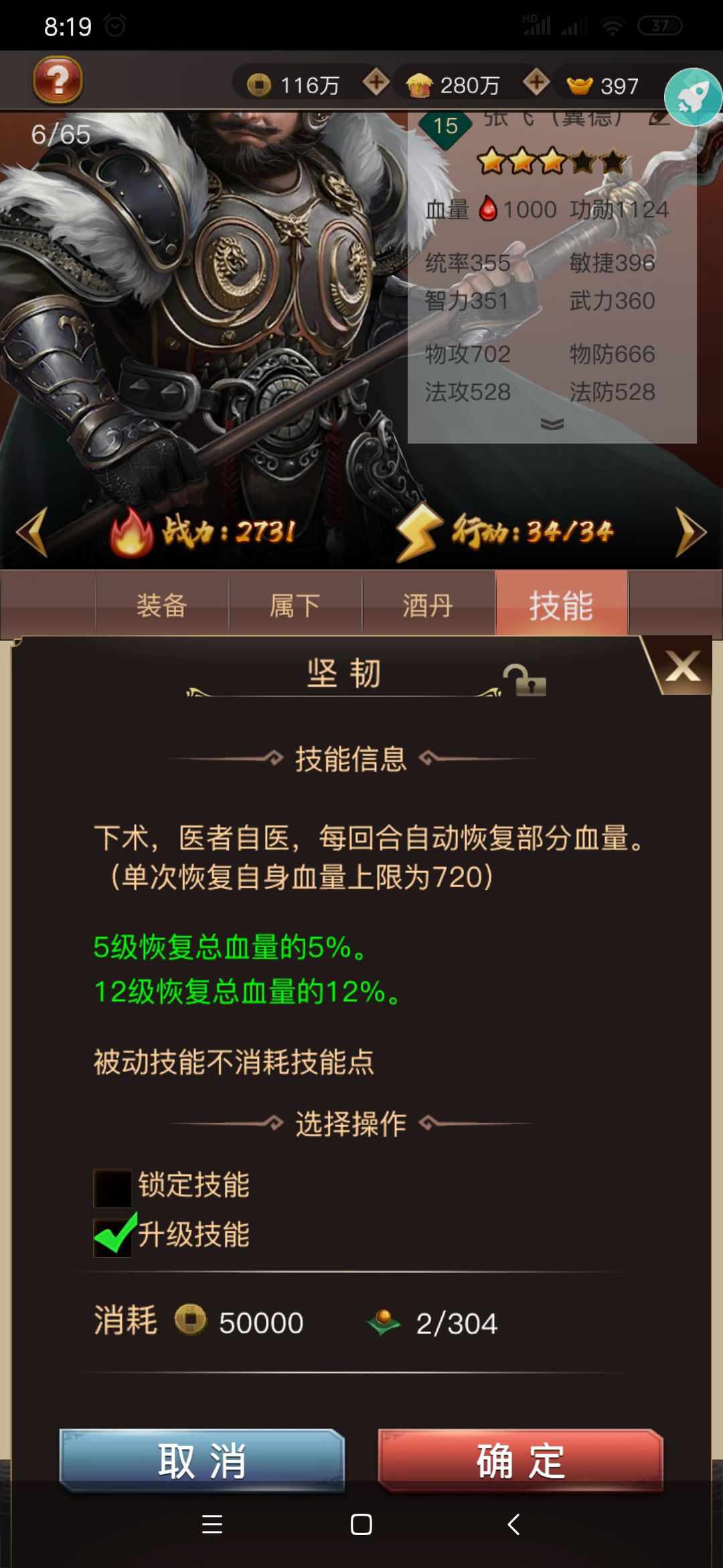 有个小游戏环节,猜三国表字,建议每次做完记下答案,全对一般能奖励一次,或者马上免cd(2小时)一次。另外元宝花在酒坊强化收益最足最长远。(可以等周三有消费返元宝的福利任务时升级)元宝获取:跟着活动走,活动里的锦屏认为,任务里的福利任务,黄巾无双任务重点关注。铜钱:升满仓库等级前期有6元满仓,城池点详情里面有驻守也可增加铜钱,在就各种活动,黄巾任务碎片和养成:活动.攻城。有个优先技巧,1是合成奖励时务必勾选“优先消耗万能碎片”,因为将领升星必须用本身碎片不能用万能,所以本身碎片>万能。2是优先有日常任务(黄忠,张辽),竞技任务的将领(点上方演武台)合成 3红将喝酒不要断,厚积薄发可以先不推剧情(16城之前喝酒不耗费体力,体力5分钟恢复1点可喝1瓶酒)战斗:战斗技巧教学“校场”任务尽快做有奖励有技巧。主要设计技能佩戴(可以通过携带妻妾获取她们身上的1个主动1个被动技能),在就左下角控制攻击顺序,非常有用。比如战斗分3波,在第一波的时候可以留1个敌人,然后先回血,吃辅助,再击杀。