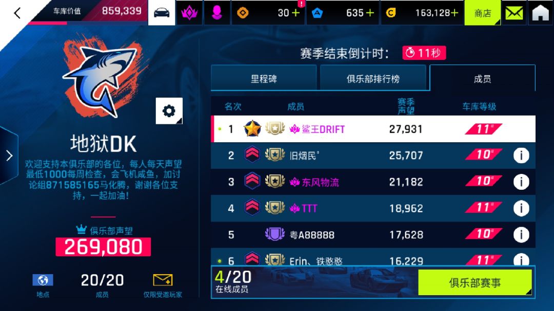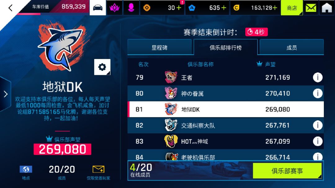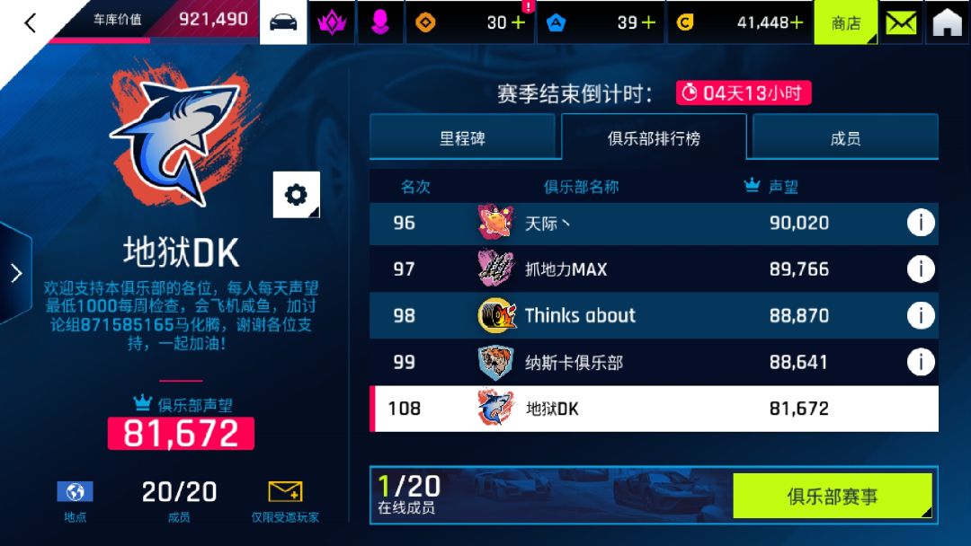 新赛季开始了,俱乐部有一个位置,上赛季前百俱乐部招活跃玩家肝帝,氪佬,上分王,大家一起加油(ง •̀_•́)ง,要有S车的因为要打每日那个S车活动,有意者先加QQ群找我:871585165谢谢各位的支持!