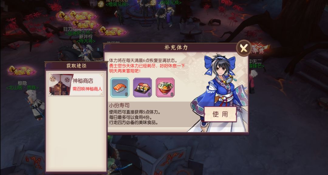 第三类任务是指系统给你的这些体力全部用完之后,你需要通过在副本中获得的神秘商人召唤券来召唤神秘商人,获取折扣之后,里面会有随机的限量道具产出,遇到所有可以增加体力的道具就全部买下来。食用之后再继续进行主线支线任务。为什么有的人升级比较快,因为他们每天会花点钱买体力药,而且体力药是不能在普通商城买到的。