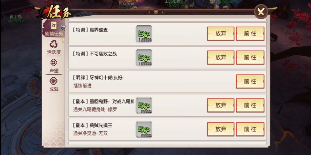 先来说第一部分,副本任务。做主线刷副本原本就是各类游戏的常规操作,《侍魂》也有自己的主线。在做主线的过程中,玩家会获得大量的经验奖励,但是,到了游戏的后期,有些主线任务做完之后也只会赠送你体力燃烧瓶,想要继续从主线获得经验的话,仍然需要先完成这类奖励体力燃烧瓶的任务。