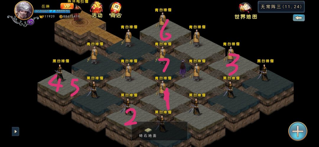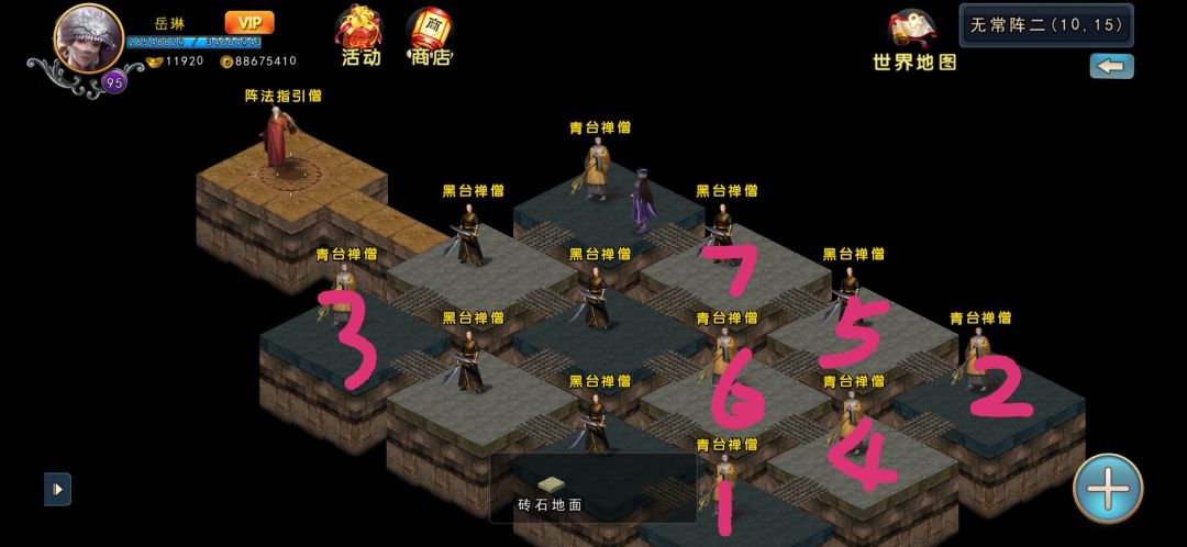 这些图片里的序号是你站位打的位置,打的时候不用管是青还是黑,只要站在那个位置打相应的人物就可以了,战斗难度低,本人300万战