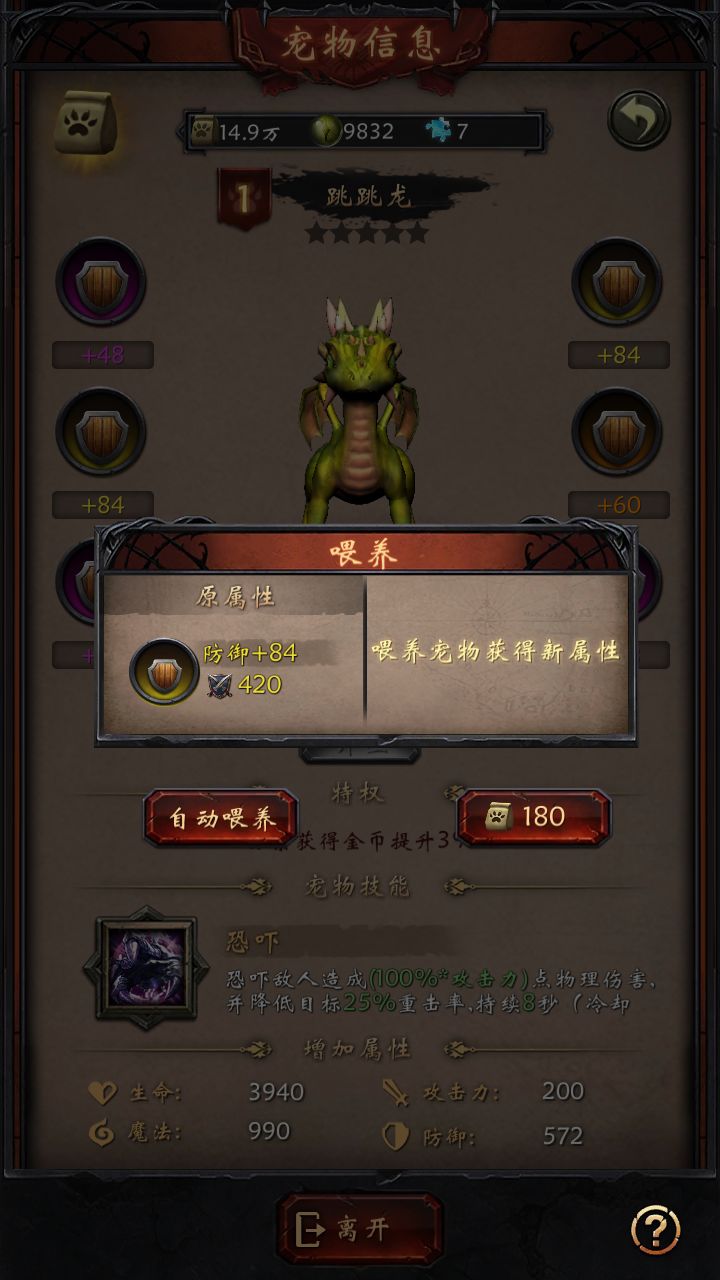 宠物天赋(被动)探索获得金币提升10%(4阶)宠物技能【恐吓】恐吓敌人造成200%攻击,并降低目标35%暴击率,持续10秒(3阶满)实战评测哈哈没有实战,就是个打酱油的宠物,养着加属性即可