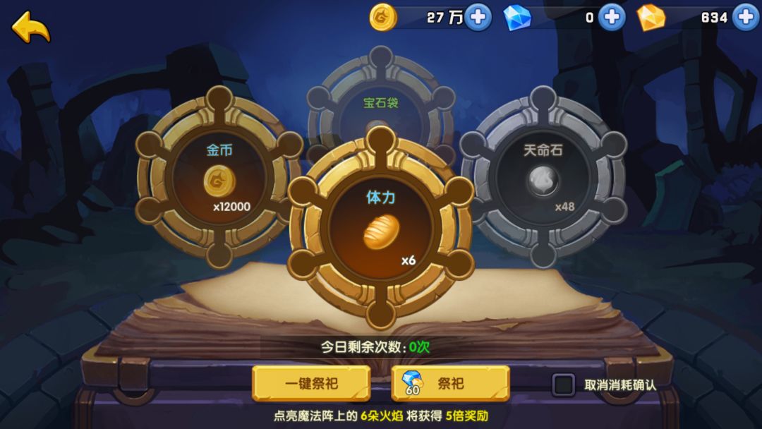 金币十次一次1.2万,一共12万,砖石5次一次50,一共250砖石,顺便还可以抢抢红包,红包完全看你手速啊,手快有手慢无,这里得提醒大家一下,看下自己军团烤火的时间是啥时候别错过了,不然这个任务完成不了也很吃亏啊,还有就是留点金币和砖石保证能够烤的吃火啊。 3.就是祭坛获取体力了,