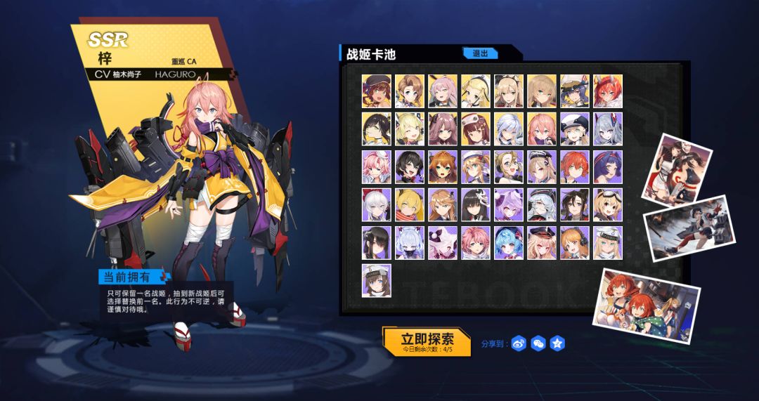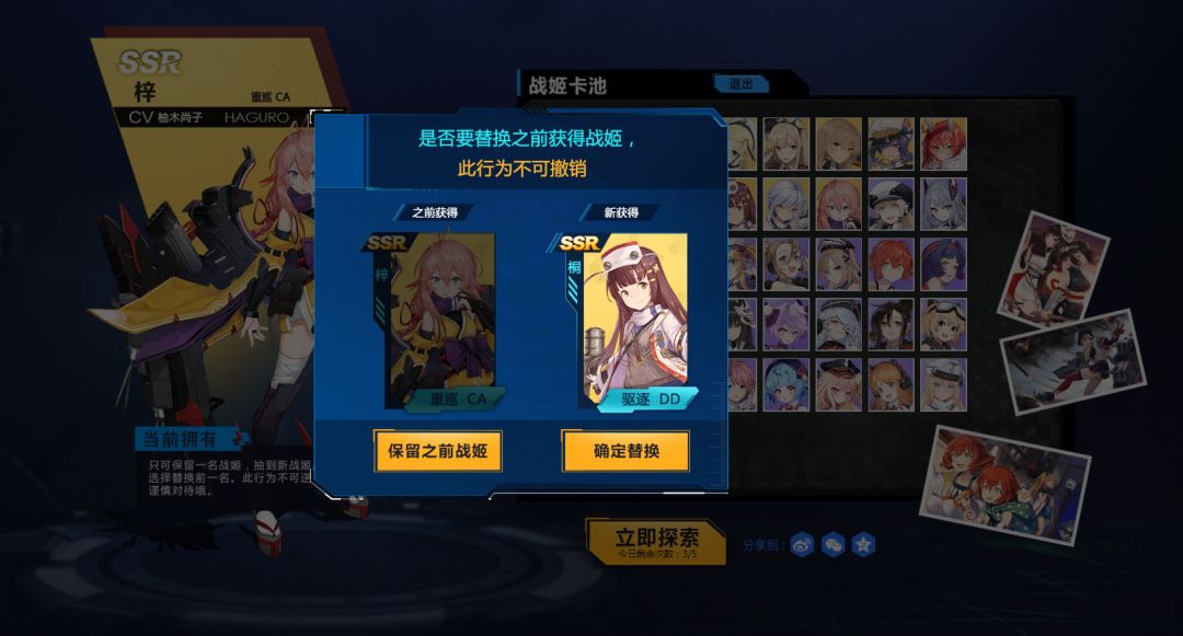 玩家在活动卡池探索选定的战姬将会显示在活动页面左侧的“当前拥有”区域,本次活动中玩家仅可保留一名战姬。探索到新战姬后可选择是否用新战姬替换之前选定的战姬,此操作不可逆,此前探索到的战姬记录也不会保留,玩家选择时应认真考虑。