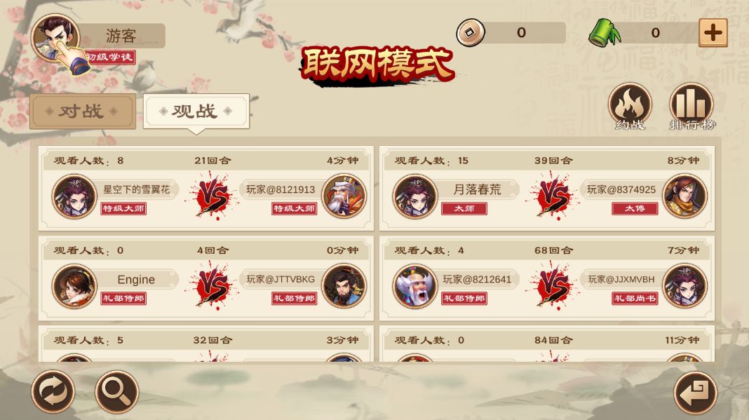 所谓高手过招,招招致命。但是高手们绝对不能闭门造车,需要与别人进行切磋,才能让自己的棋艺更上一层楼。于是我们可以在联网模式下,与全国各地的棋艺高手进行对弈,联网模式分为:棋技博弈、五分钟场、十分钟场和二十分钟场;当然了,进入联网模式的话需要花费100个君子竹。