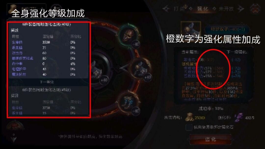 首先最重要的便是“强化系统”。强化可以给装备的基础属性带来提升,同时全身强化达到对应等级时也能获得额外加成。