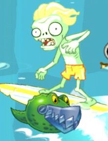 被动:在水中保持冲锋模式,并且无视植物——直接穿过去但不会杀死他们。上岸后遇到植物就会用冲浪板秒杀所遇到的植物,冲浪板会占一格位置。