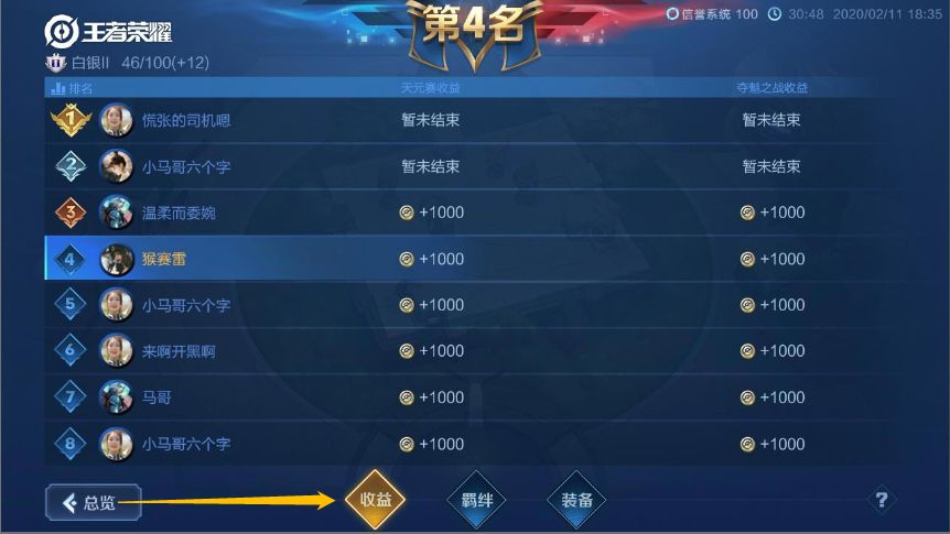 结算时,总览-收益界面可查看各玩家在天元赛中的天元币收益情况