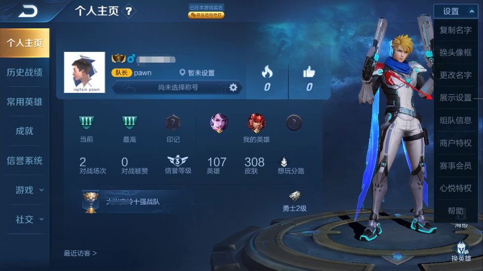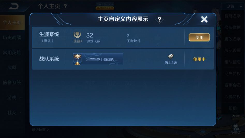 当所在战队达到区级及以上时,大家可以在个人主页新增的展示设置中,将你的战队荣耀展示在个人主页中。
