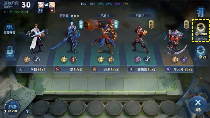 在局内战胜其他玩家获得的天元币可以用来刷新英雄,每一次刷新时消耗的天元币数量会依次递增