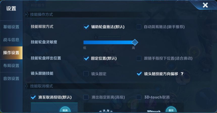 本次功能在设置界面-操作设置切页-技能操作方式模块下开启,开启后下列英雄技能将实现偏移效果。
