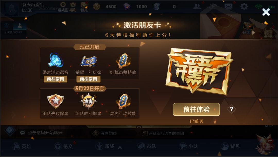 3月19日~3月22日期间,在大厅聊天窗中,发送指定口令“朋友嗨起来”,即可激活朋友卡!立即获得6大特权福利!