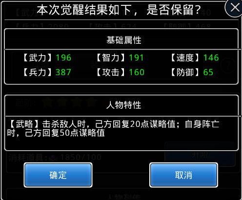 作为天选之人,长期沐浴天地精华,当主角等级提升至50级时,即可进行觉醒。每次觉醒,主角都将获得新的属性与武将特性,主公可选择保留或放弃本次的觉醒结果。