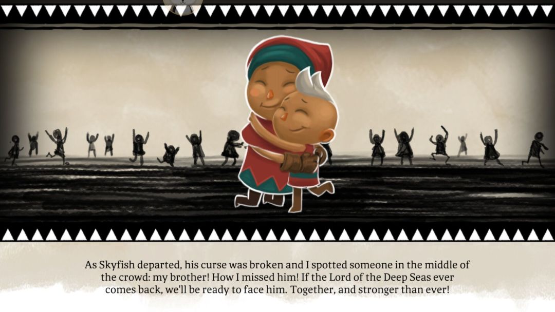 天空鱼离开的时候,他的诅咒被打破了,我在人群中间发现了一个人:我的兄弟!我好想他!如果深海之王回来,我们就准备好面对他了。团结在一起,比以往任何时候都更强大!