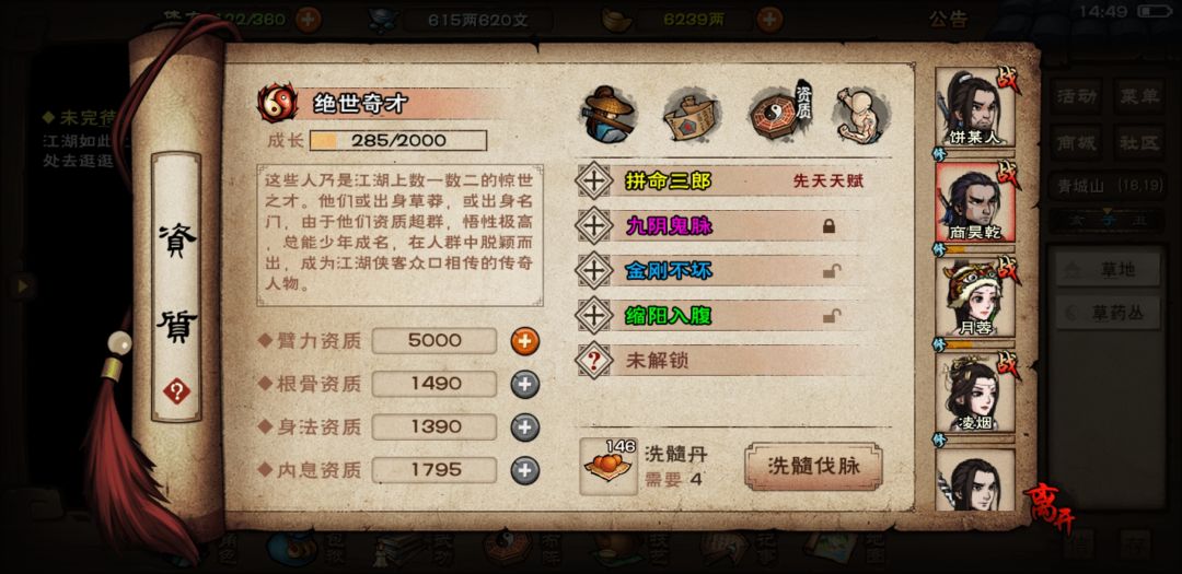 步奏1、准备条件:200+洗髓丹(个人建议,免得白浪费时间)、洗脉的角色开2条以上天赋(不建议直接开4条,置换的时候会多费丹。最理想的状态是只开2条天赋,同时准备足够的资质丹随时可以开第三条天赋)。