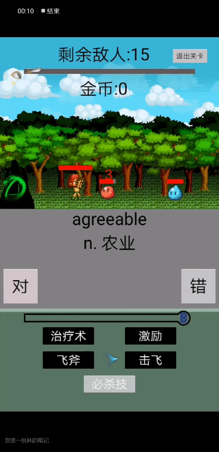 (3)角色就会使用技能了!要根据不同的怪物选择释放不同的技能。游戏30%靠单词准确率,30%靠技能选择,40%靠技能等级。所以如果单词准确率不高的话,那就多多在游戏中学习单词然后获取金币升级技能等级也是可以通关的!