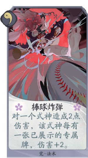 卡牌作用:觉的强力解卡,配合觉的基础能力几乎可以处理一勾玉任何场面,觉醒后更是稳定击杀对方核心式神,根据相关展示卡牌数量决定伤害,使用起来也没有什么负面效果,在部分觉卡组中地位还是很高,尤其是雪女会给自己提供大量雪球,这个雪球也是雪女的专属牌,所以会触发我们棒球炸弹的加成。