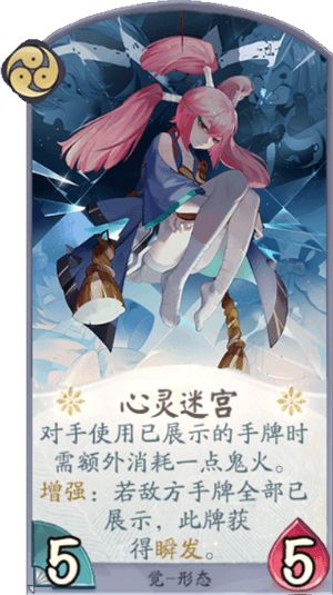 卡牌效果:形态牌,对手使用已展示的手牌时需额外消耗一点鬼火。 增强:若敌方手牌全部已展示,此牌获得瞬发。