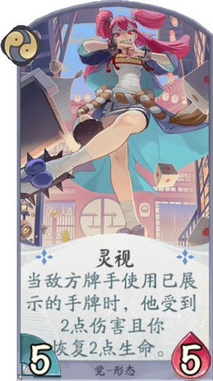 卡牌效果:形态牌,当敌方牌手使用已展示的手牌时,他受到2点伤害且你恢复2点生命。卡牌作用:觉抗快攻的优秀形态,二勾玉如果能准时使用,很容易让对方打着打着就自己牌手血量变得很低,不过因为现在觉都以觉醒为核心,前期看牌数量太少经常导致这张形态牌发挥不出本身的强度。(当然5血形态都会被凤火稳定吃)
