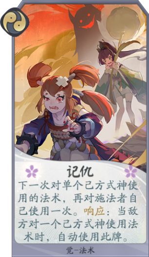 卡牌效果:法术牌,响应牌,效果是下一次对单个己方式神使用的法术,再对施法者自己使用一次。响应:当敌方对一个己方式神使用法术时,自动使用此牌