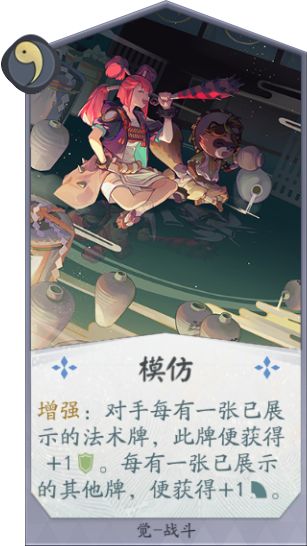 卡牌作用:模仿是觉唯一的一张战斗牌,前期可用来抗住压力,后期则多用来爆发,斩杀。不过这个卡是根据对面已经展示的卡才获得攻击或防御效果的,这些效果都是要看对方的式神构成与带牌构成的,增强也是随着展示手牌数量类型而随时变动。