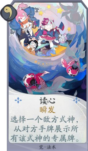 卡牌作用:读心作为一勾玉瞬发法术,特效方面可以观看一名式神所有专属牌,但是一勾玉回合很有可能并没有什么值得观看的价值,携带的话也多数和棒球炸弹进行配合,如果想要携带不太建议在一勾玉直接使用。