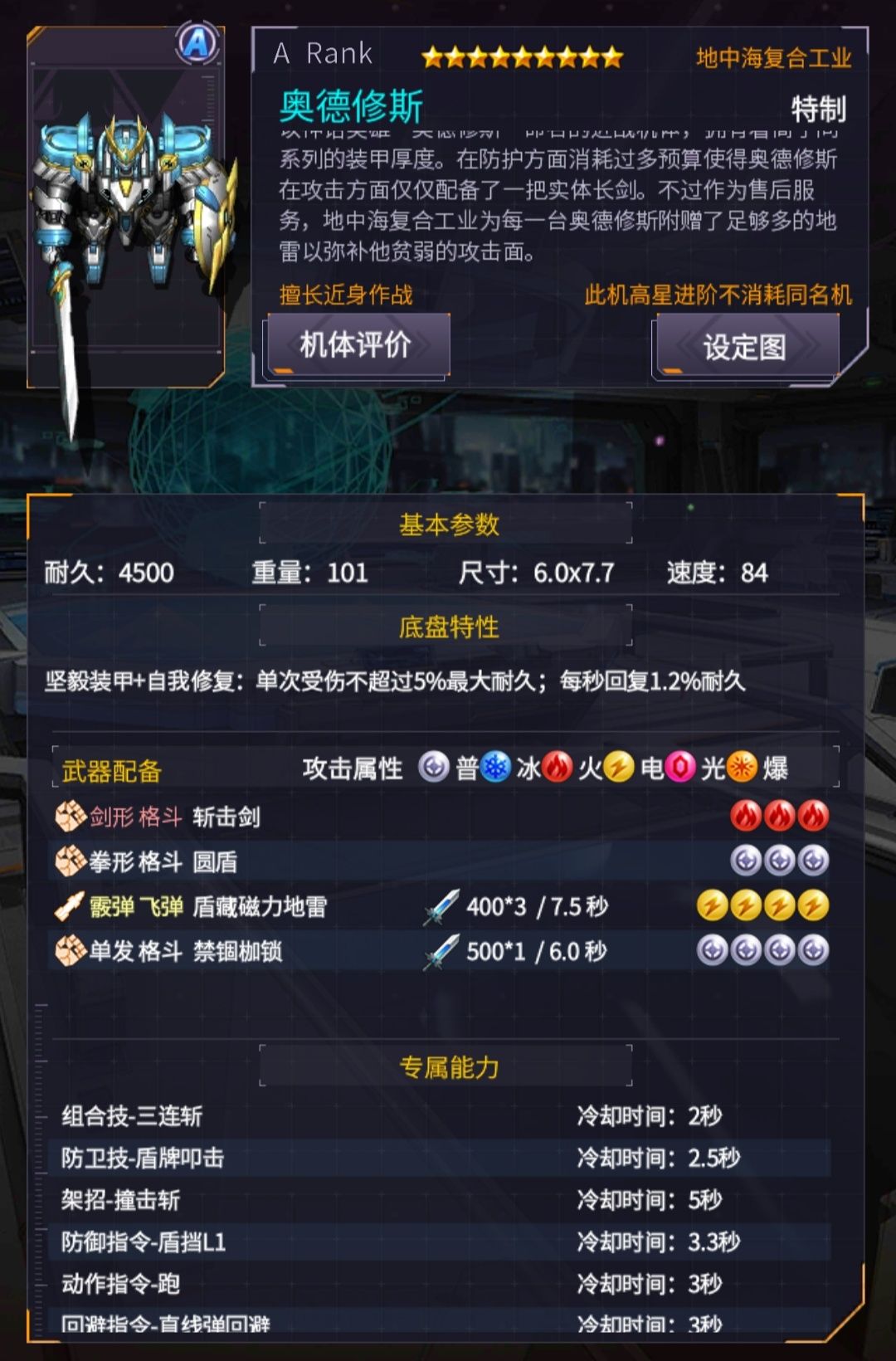 然后是奥德修斯,这主要是一台免费送的机子。可以通过推图获得。作为一个近战,自带的刚毅和回血使它成为初期最能抗的机子之一。但是呢,他的缺点就是他是一台A机。血量上较低,满星只有4500的血,而前期在面对高射速低威力的武器面前显得太脆。但自身输出还算过得去,可以培养并且用于特定的战斗。