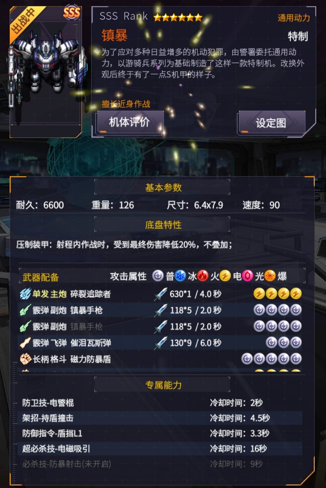 下来是镇暴,这台机体就如同他的名字一样,目的就是为了镇暴的。固然有着很强的抗压能力。本身的防御能力很强,作为不二改的机子中少有的不靠吸血就能有着不俗的生存力。虽然本身输出并不高,但他就是肉啊。而且在不需要二改就能拥有的超必杀技电磁吸引,是无数高机动小怪和高输出脆皮怪的绝对克星,能讲所有小怪聚在一起然后能配合aoe单位收割战场。如果你能抽到一台,那么前期他的坦度和控制强度会为你提供绝佳的便利和游戏体验。如果没抽到也没关系,他和雷泽顿都能从12章里刷出来,12章也是白鸟的生产地。同时雷泽顿,贝卡斯的好感度道具以及和雷泽顿mk还有镇暴配套的宠物都能在这里刷出来。有时间的话可以来刷一刷。