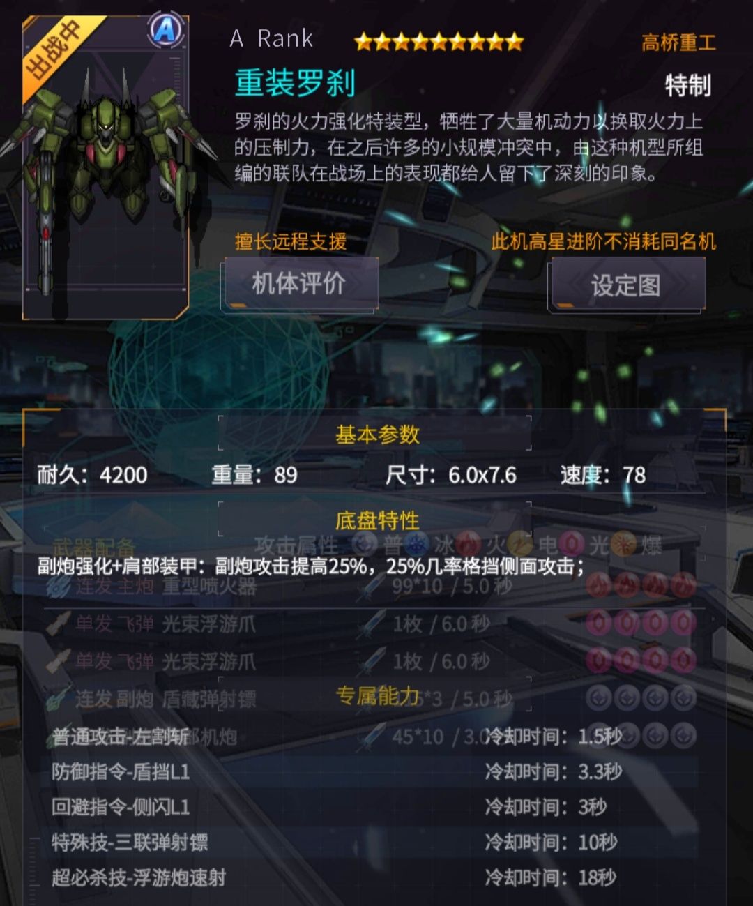 下来是重装罗刹,没有抽到的小伙伴可以通过无双商店里兑换。这是A机中火力最强的几个。首先光束浮游炮的高射速高伤害以及火焰的AOE,面对各种方向的杂鱼和高机动小兵能够轻松应对。其次它的的火焰和浮游炮也能让试图近身的近战吃足苦头。如果能培养成满星,这个机子可以给男主开推图当中程机用并且男主的被动可以弥补它太过脆弱的问题。这台机子在你有着高星的S机后排前可以充当火力担当。