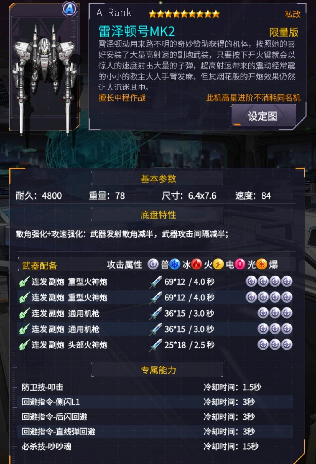 雷泽顿MK2这台机子需要去反复地刷吵闹蝙蝠的事件并且爆率感人,但是一旦你刷出来了同时配合机师雷泽顿,那么我可以很负责地告诉你你新手时期的输出不用愁了,并不需要超改成S就有着极高的输出,就算你除了它全都是肉坦的阵容你也不用担心输出不够。面对前期各种boss只要保护好它,boss就会被它轻松收割。虽然攒起来不容易但是攒齐了会很舒服,如果你一直抽不到理想的机体那么你可以考虑去搞一台雷泽顿mk2。