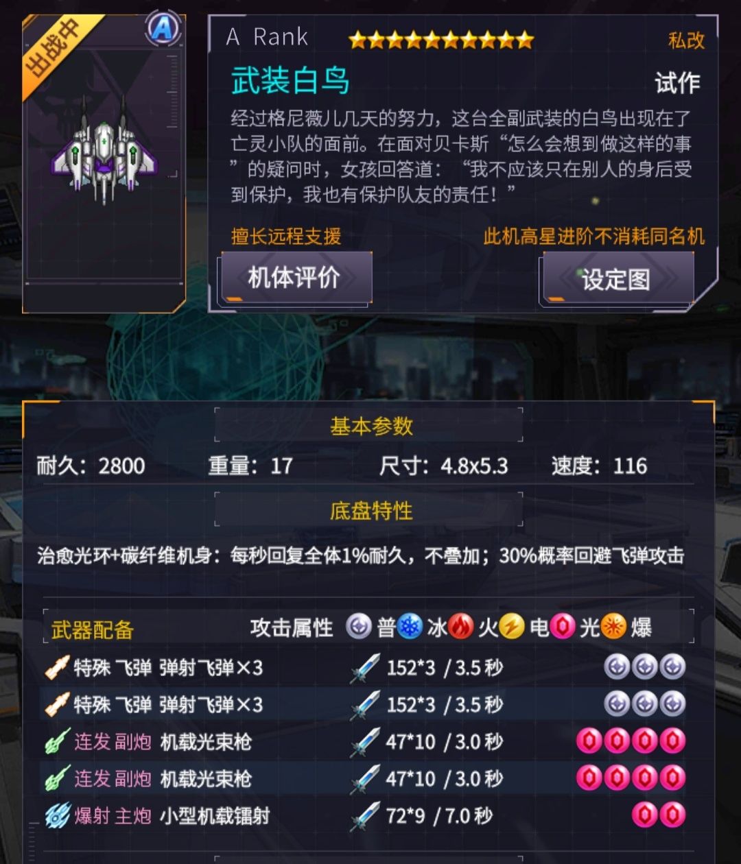 下来就是‘女主’格尼薇儿的白鸟了,很多人一看这是个B机,然后也没什么火力就扔了甚至分了,却不知道这是对新手最友好的机子。一下强化到满星只需要900核心。尤其是现在能超改成A机。而你需要的仅仅是为它准备一些必要的低廉的材料。白鸟改的战斗力也是不容小觑的,作为小飞机有着不俗的风筝和生存能力再加上治疗光环这一前期推图的神技,新手们建议人手都做一个,这个机子可以一直用到你有高星信天翁的时候。
